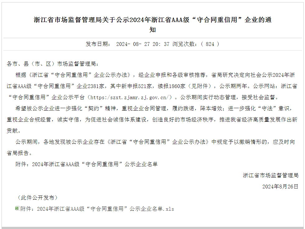 浙江JDB电子试玩平台公司传来喜讯,经过严格的申报和评审,公司成功荣获2024年浙江省AAA级“守合同重信用”企业称号。这是对浙江JDB电子试玩平台长期以来坚持诚信经营、规范管理的高度认可。